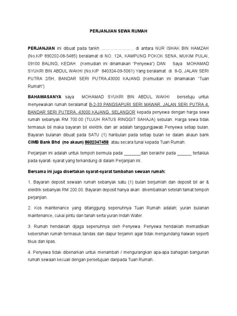 Contoh Surat Perjanjian Sewa Rumah Di Malaysia Gingerqwe